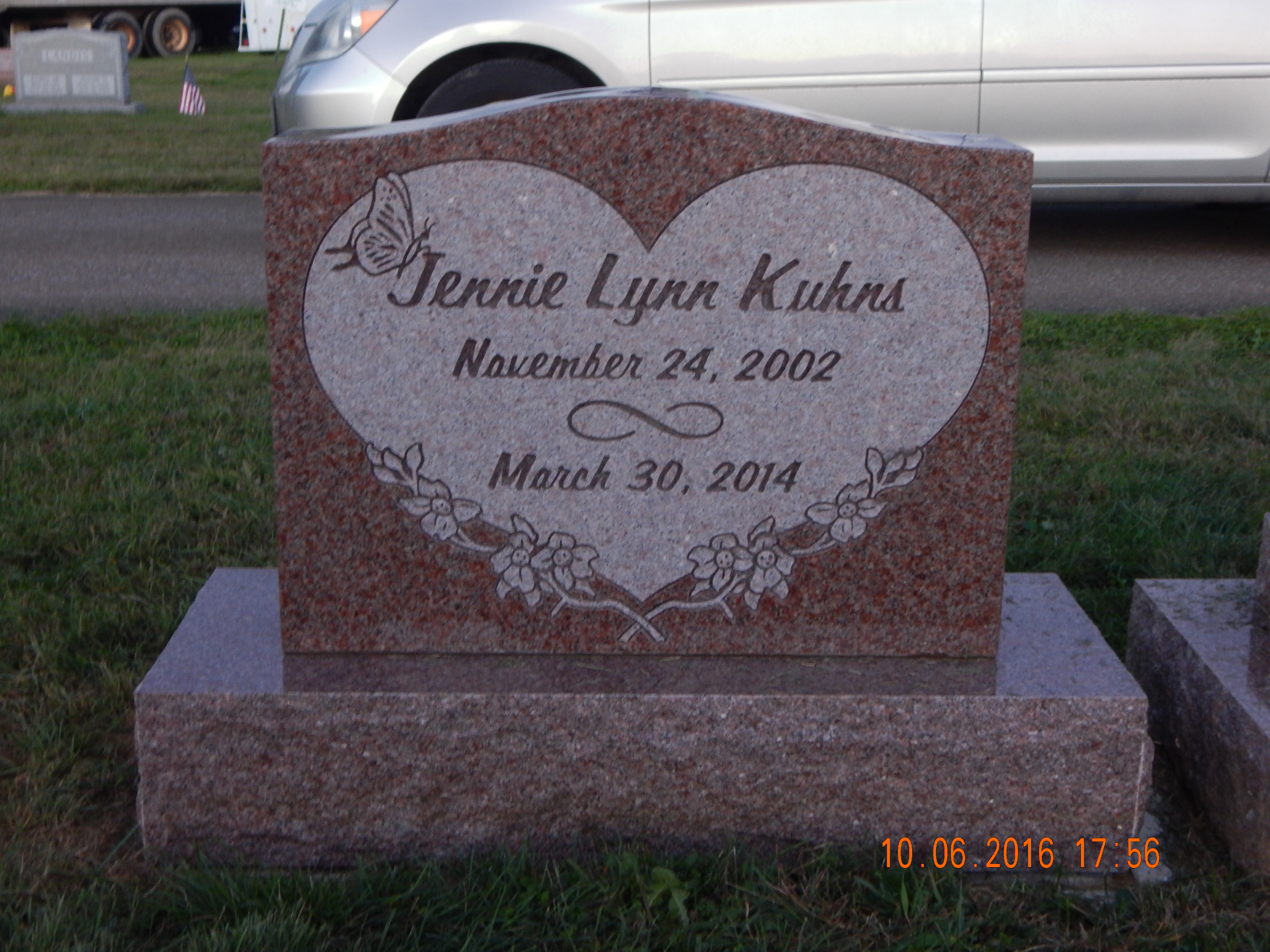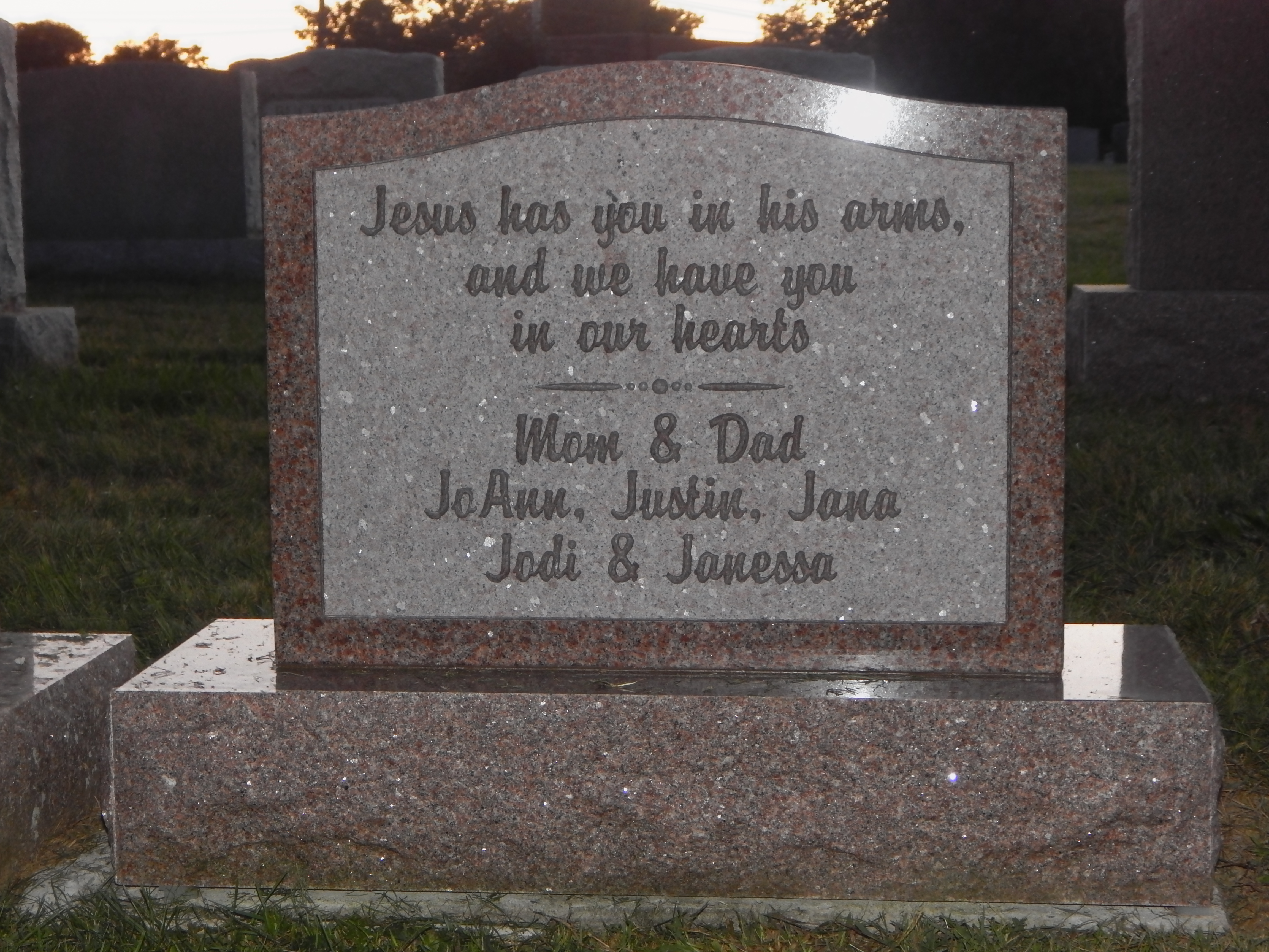 It’s carved in stone. Yes, I have known Jennie died but seeing your child’s name, birth date and death date carved in granite does something to your heart. I’m not sure I have the words to put to the emotions, the feelings in my heart. It’s hard evidence of shattered dreams, of living out a painful reality– our child has gone before us. It wasn’t supposed to be this way. We shouldn’t have had to spend months looking at designs, fonts and options and more options. Trying to imagine our child’s name in this or that font with this design or that design. And there were times I just wanted to grab all those papers and throw everything in the trash and scream, ‘No this is so wrong!” But the reality is- we did it. we finally decided on a design that would honor Jennie. And yet through the pain, through the hard decisions I felt, I sensed, God my Father there saying, “I’m hurting with you. It’s not what I wanted either.” And then I had to wonder. What did God want? He made us creatures of choice. And He wanted us to choose Him but instead we chose to question Him, to believe He was keeping something from us. And in one sense He was; He was keeping death, pain and suffering away. It was never His plan, His will for us to experience death, pain and suffering. But we chose to eat of the tree of knowledge instead of the tree of life. Yeah, I know it was Adam and Eve who actually did it, but I’m not much different from them. And God couldn’t stop the consequences of the choices that were made; so we live in a world of death, pain and suffering. But God had a plan for redemption and through Jesus’ work on the cross we can be redeemed. And that is what I hang on to- -day after day- – knowing that God is making beauty out of ashes and will turn my mourning into joyful dancing. And some day we will live in the beautiful world we were created for.