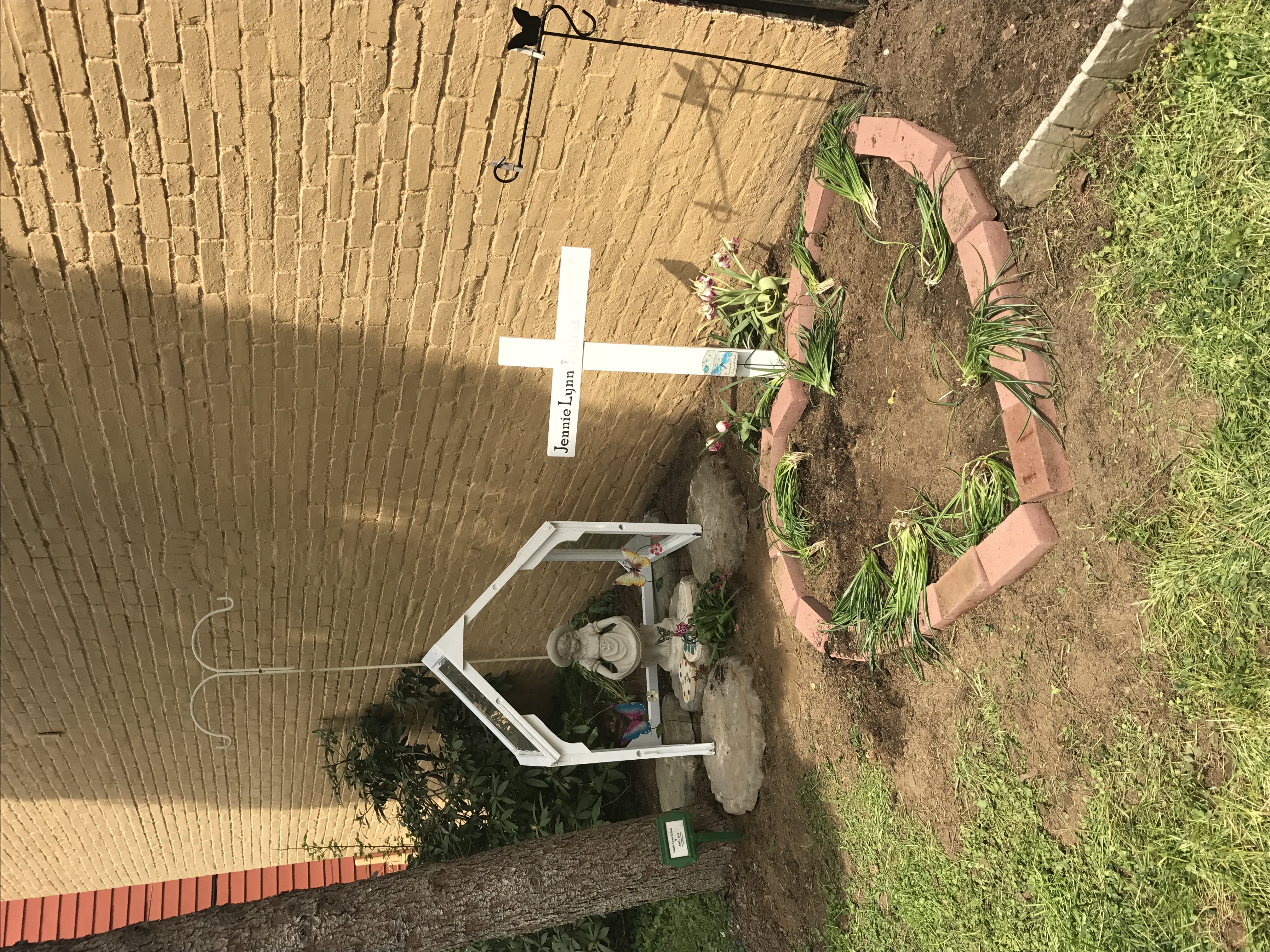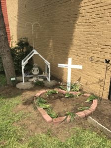 A friend spent most of a day and helped move Jennie’s memorial garden. We transplanted the bulbs and set it up. Now we want to plant annuals for the summer and add a few more pretties: solar lights, flower pots, a flag and maybe a hummingbird feeder.