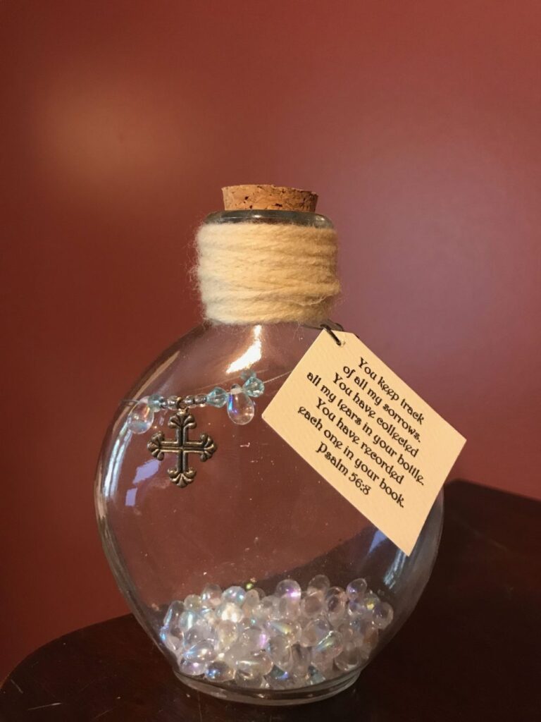 And please don’t be afraid of ours tears. They are not sign of weakness or anything bad. They are rather God’s treasure; He collects them in a bottle. We all collect things we treasure. Again we know you can’t fix our grief or make it better but giving us a tissue and a shoulder to cry on tells us you care and that helps us heal. Just remember healing is a life-long journey and we’ll need lots of tissues and/or shoulders. Being witness to someone’s tears is uncomfortable, disconcerting because we know deep down we can’t change or fix the reason for their tears. We come face to face with our limitations which require us to be humble and ask for Divine help. We want to believe we’re capable of doing life mostly on our own. Yet Jesus wept when He came to Lazarus’ tomb and He knew He was bringing Lazarus back to life. I believe He wept to show Mary and Martha how much He loved and cared for them. He heard and validated their pain and grief with His tears. And we want to be followers of Jesus, so let’s step into the uncomfortable and cry with those that are crying.