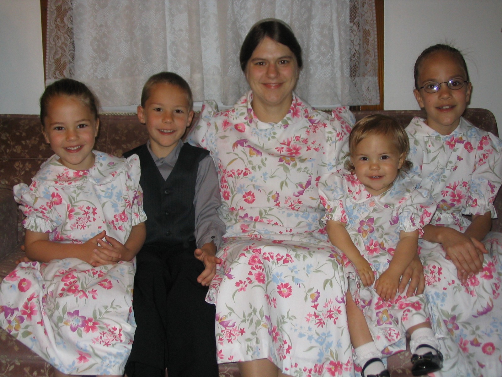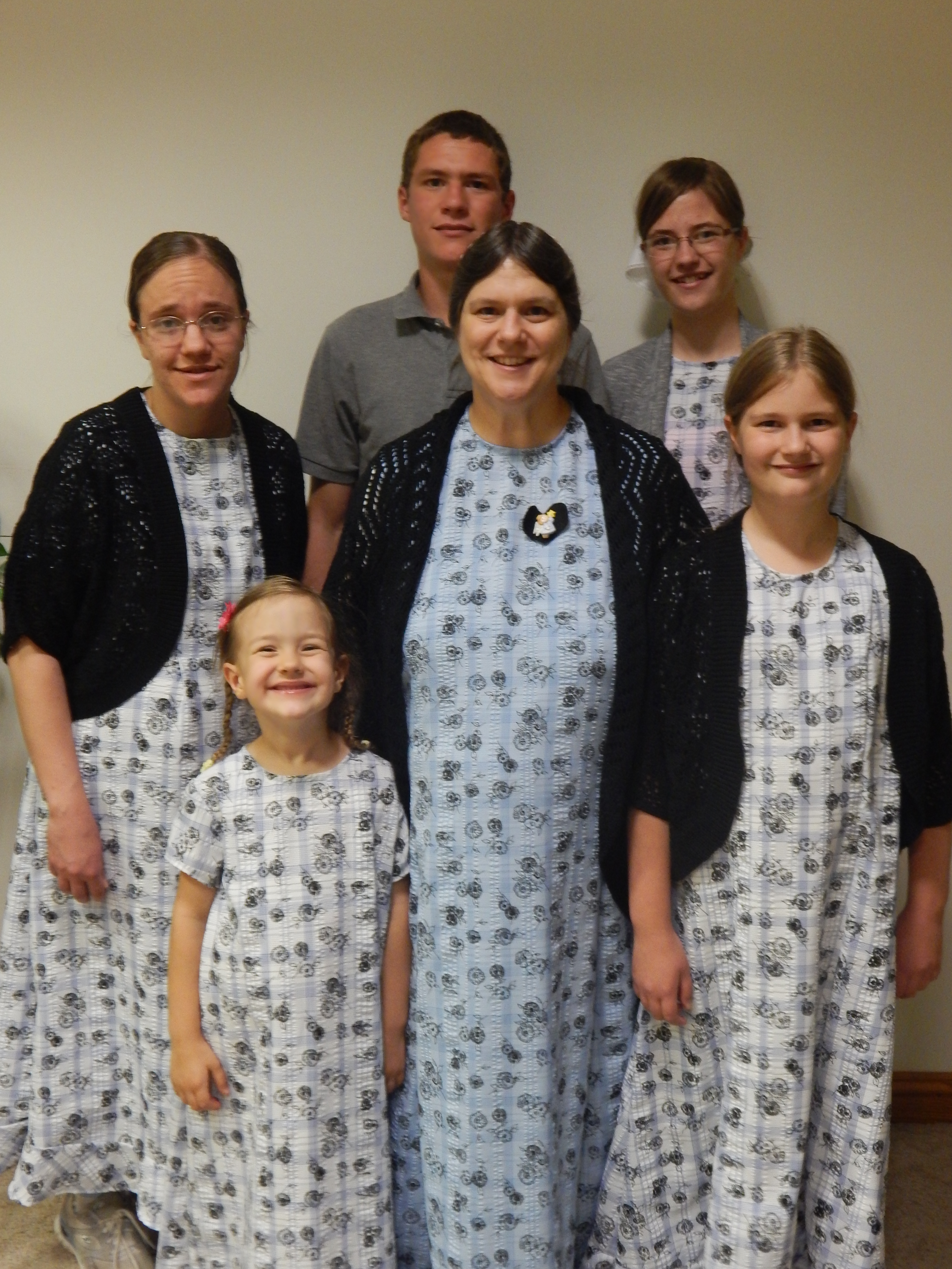 We have since 2004 every four years made look-alike dresses for Mother’s day. And this would again be our year for look-alikes, but I wasn’t sure I wanted to. Yes, part of me did, I love to sew and of course, who wouldn’t want a new dress. But there was one young girl who was always so excited about new dresses and taking our pictures and she isn’t here this year. I struggled with it: to do it, does that mean we’re moving on and leaving you behind, forgetting about you. To not do it, does that mean we haven’t accepted your death, our losses. This year it is different. It is again another first for us to live through. We talked about it and we decided to go ahead but we did add a twist to it. Our dresses aren’t exactly the same. Similar but not the same and it seemed to us that doing it this way this year was how we could honor Jennie. And of course I wore your angel pin in memory of you, Jennie dear. I think you’re having a great Mother’s Day in heaven with grandma.